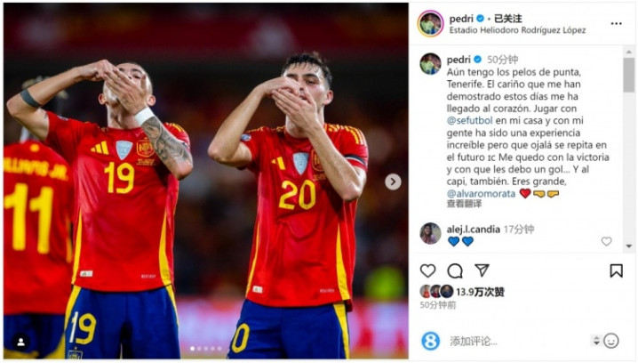 此役在佩德里的家乡特内里费进行,赛后佩德里在冒昧媒体上晒出庆祝进球的相片,并写谈:“直到当今我仍然心潮倾盆,特内里费。这些天里全球对我的感情震荡了我的心,在家乡长辈眼前代表西班牙队出战,这是一次不行想议的履历,我但愿昔时还能有这么的契机。”